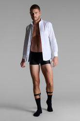 Die Dessous mit Trompe l’œil-Effekt spielen auf verführerische Weise mit der Wahrnehmung und den Codes der Maskulinität.