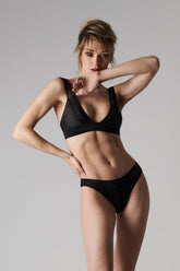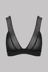 BH mit tiefem V-Ausschnitt, ohne Bügel. Das transparente, grafische Streifen-Design im Ajour-Stil akzentuiert die natürliche Form der Brust. Strukturierte Cups durch breite Träger auf der Vorderseite, durch zwei elastische Träger auf der Rückseite verstellbar. Breites, unifarbenes Unterbrustband, mit schwarzer Mikrofaser überzogen. Verstellbarer Hakenverschluss am Rücken.