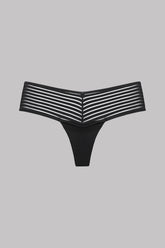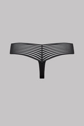 Tanga aus Mikrofaser mit transparenten, grafischen Streifen im Ajour-Stil. Ausgeschnittene Form dank breiter Bänder, die in subtiler Weise die Hüften betonen. Im Schritt mit einfarbiger, schwarzer Mikrofaser ausgeführt.
