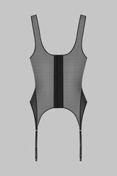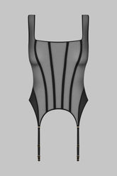 Top mit Strumpfhaltern aus absolut transparentem Tüll. Korsett in Vintage-Optik mit geradem Dekolleté und Quernähten, von vertikalen Bügeln strukturiert. Der an den Seiten gefütterte Tüll sublimiert die Hüften und geht in verstellbare, abnehmbare Strumpfhalter über.