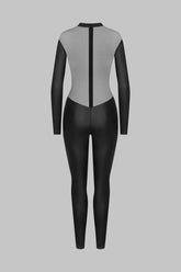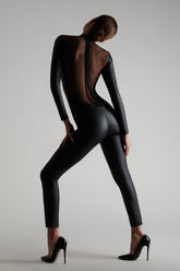 Catsuit in doppelter Optik: mattes Leder und transparenter Tüll. Grafische tiefe V-Ausschnitte aus Tüll, die das Dekolleté betonen und den Rücken freilassen. Von vorne nach hinten mit einem Ton in Ton verlaufenden Zweiwegereißverschluss zu schließen. Als Kennzeichen der Kollektion ziert ein vergoldeter Ring im "Feti-Chic" den Kragen und regt zum Festbinden an.