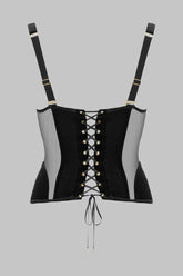 Quilted velvet enhances the bust and hips, contrasted by ultra-sheer tulle panels along the sides that trace clean lines down the torso. The wide straps, velvet-covered at the front, are adjustable and removable to suit any styling desire. At the back, an adjustable lace-up fastening with gold eyelets and jewelry-like tips allows for a close-fitting, waist-defining silhouette.