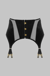 Quilted velvet outlines the hips, contrasted by ultra-sheer tulle at the front and back that subtly reveals the skin and elongates the silhouette. At the front, a metal busk with golden hooks fastens the garter belt like a true corsetry piece.