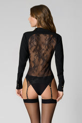 The garter shirt features a structured cut at the front and delicate floral lace at the back, choosing precisely what to reveal. Crafted from opaque crepe, this piece is finished with a French collar, gold shank buttons, and openable cuffs. Detachable Maison Close suspenders extend the silhouette all the way to the legs.