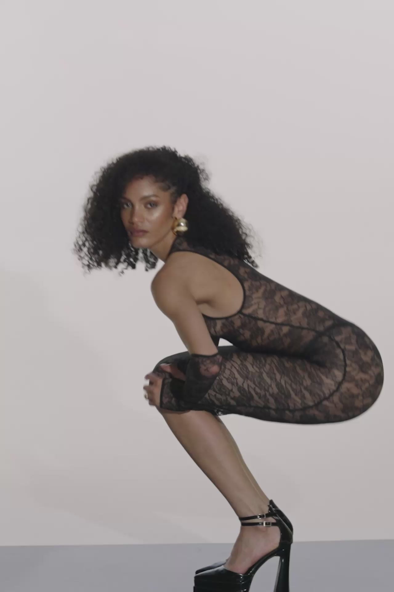 Das lange Kleid ohne Ärmeln ist mit Lochspitze verziert, die größtenteils aus recyceltem Material gefertigt wird. Eng anliegender Schnitt und flaches Gummiband. Midi-Länge, die die Kurven betont, für einen selbstbewussten 80er-Jahre-Stil.