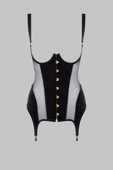 The corset extends into integrated garter straps, which are non-removable and non-adjustable. Gold jewelry-inspired clips engraved with ROCOCO complete the piece as a bold statement of seduction.