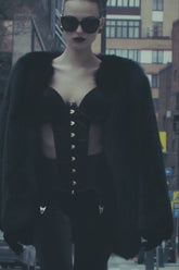 With no cups and underwired construction, it naturally embraces the bust. At the back, an adjustable lace-up detail, adorned with gold eyelets and jewelry-like tips, allows for personalised cinching. Quilted velvet enhances the hips, contrasted by ultra-sheer tulle panels on the sides that trace clean lines along the torso. The wide straps, velvet-covered at the front, are adjustable and removable for versatile styling.