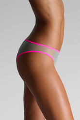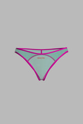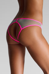 Open briefs in transparent pastel tulle, highlighted with ultra-flat fluorescent elastic. Our signature heart-shaped cut at the back for added lightness. Maison Close logo in relief at the front. No cotton lining for complete transparency.
