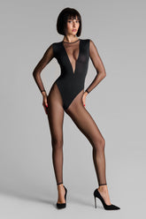 The V-neck long-sleeve catsuit – Pure Tentation wraps the body in a soft glow. Made from sheer tulle and opaque microfiber, it creates a graphic and sensual thong-body illusion effect.