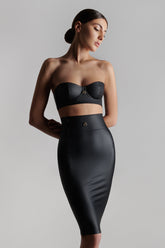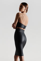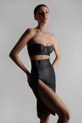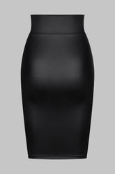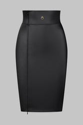 Rock in Mattlederoptik. Sehr eng anliegender Schnitt und ein breiter Gürtel, der die Figur betont. Kann vorne mit einem Ton in Ton gehaltenen Zweiwege-Reißverschluss geöffnet werden. Als Kennzeichen der Kollektion ziert ein vergoldeter Ring im "Feti-Chic" die Vorderseite und regt zum Festbinden an.