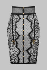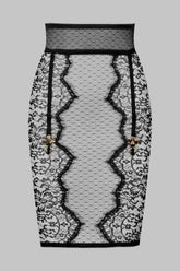 Rock mit Strumpfhaltern Kombination aus steifer Wimpernspitze und Plumetis-Tüll. Ein elastischer Bund mit Ziernähten strukturiert die Taille perfekt. Vier verstellbare und abnehmbare elastische Strumpfhalter mit Goldkreuz. Nicht aufknöpfbare Goldknöpfe schmeicheln Ihren Kurven.
