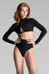 Das rückenfreie Top aus der Kollektion Nuit Infinie vereint schlichte Eleganz mit raffinierten Details. Der hohe, mit einem schwarzen Metallhaken verstellbare Kragen rahmt den Hals elegant ein und offenbart eine zarte, abgerundete Öffnung am Rücken. Die Schnürung am Dekolleté enthüllt subtil die Brust, während der figurbetonte Schnitt und die langen Ärmel eine raffinierte Silhouette schaffen – perfekt für Tages- oder Abendlooks.