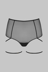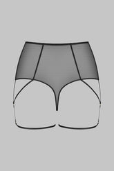 String mit hoher Taille aus absolut transparentem Tüll. Die quer verlaufenden Nähte gehen an den Oberschenkeln in verstellbare, nicht abnehmbare Strumpfhalter über.