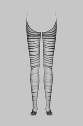 Asymmetrische Strümpfe aus transparentem Tüll. Eine äußere Plissee-Naht verläuft von der Fußspitze bis zum oberen Ende der Hüfte. Ein schräges Cut-out-Detail enthüllt einen sinnlichen, herzförmigen Po-Ausschnitt. Am Beinausschnitt befinden sich zwei abnehmbare Strumpfhalter mit goldfarbenen Accessoires, die sich nach Belieben an Ihren Dessous befestigen lassen.