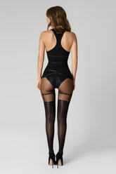 The PARURE CLOUS black garters elegantly trace the legs. Embellished with gold studs, they are made of fully adjustable elastic bands to suit all body types. Featuring gold garter straps, they allow for a graceful pairing with stockings. Wear them on their own or coordinated with the matching panty and harness. An accessory that connects the body to the detail.