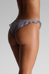 Tanga in transparent chiffon, light and airy. The elastic waistband gently follows the body’s curves. The high-cut French silhouette is finished with delicate ruffles that highlight the hips and bring a retro 80s flair.