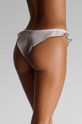 Tanga in transparent chiffon, light and airy. The elastic waistband gently follows the body’s curves. The high-cut French silhouette is finished with delicate ruffles that highlight the hips and bring a retro 80s flair.
