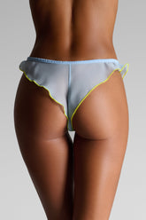 Tanga in pastel-colored chiffon, trimmed with fluorescent accents. A distinctly feminine French cut, elasticated at the waist and delicately high-cut with airy ruffles, elongates the legs and gracefully reveals the hips. No cotton lining for complete transparency.