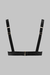 The wide straps, velvet-covered at the front, are adjustable at the back for a perfect fit. A wide underbust elastic band, fully wrapped in velvet, cinches the figure and enhances support. At the back, a golden hook fastening allows for adjustable closure.