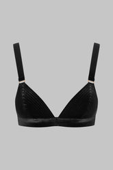 ROCOCO triangle bra in full velvet, designed to gently embrace the bust. Wire-free, it offers support through lightly padded cups in soft foam, covered with quilted velvet that shapes a retro silhouette.