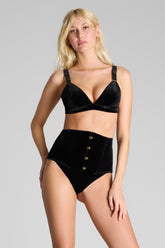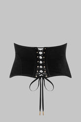 ROCOCO waist cincher in full velvet, inspired by traditional corsetry, designed to wrap the waist and sculpt the silhouette. Flexible steel boning creates a cinched, shaping cut while remaining comfortable to wear.
