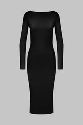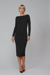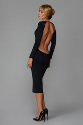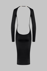 This backless dress stands out for its body-hugging midi cut, which hugs the body and creates a sleek, assertive silhouette. Made from opaque stretch jersey, it has long sleeves and a plunging back that really turns heads. It fastens at the nape of the neck with double removable and adjustable suspenders with Maison Close lettering embellished with unique gold jewellery clips. The seamless boat neck emphasises a graceful neck.