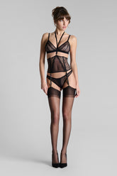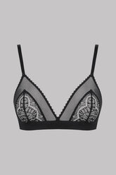Triangle bra with no underwiring, in recycled lace. Shape combining a rigid lace and see-through tulle edged with picot elastic. A wide elasticated underband provides good support. Adjustable elasticated straps and adjustable hook-and-eye fastening on the back.