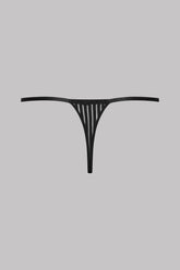 Microfibre adjustable mini thong with openwork, transparency and graphic stripes. Elastics with adjustable silver trim on the sides adapts to all body types.