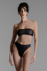 Bandeau bra wireless, crafted from fine jersey with shiny and subtly transparent highlights. It is edged with ultra-flat elastic invisible under clothing. A wide elastic band provides support around the bust. The Maison Close golden logo signature is displayed at the back. Pulls on and off over the head.