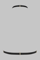 The TAPAGE NOCTURNE jewelry harness frames the bust like a nocturnal adornment. Crafted from matte, opaque black microfiber, it embraces the skin with a second-skin effect, while a removable snake chain links the underbust band to the choker ring, tracing a luminous line along the neckline. Fully adjustable and opening at the back and neck with hooks, it layers over lingerie or an open silhouette to define a graphic, nocturnal and resolutely statement look.