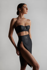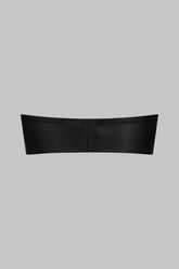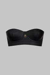 Matte leather effect bustier bra. Half-moon underwired cups without pads . Lined on the front and the cups for a seamless appearance. The collection's signature "feti-chic" ring embellishes the décolleté, inviting you to attach it. Adjustable hook-and-eye fastening on the back.