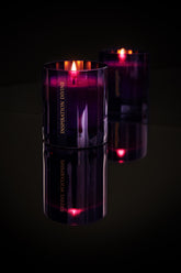 Lacquered, screen-printed faceted glass that gives the candle flame a unique colour as it gradually burns down.