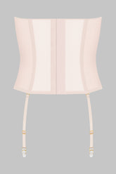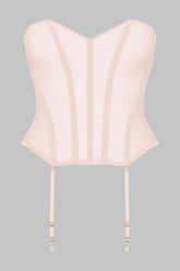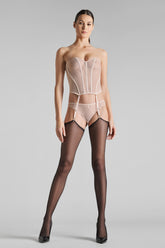 Garter belt corset in 100% sheer mesh. Structured corset with flexible vertical boning in the front and back. Transverse seams extended into adjustable and removable garters. Seamless lined sides for an enhanced silhouette.
