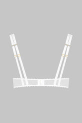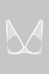 Cupless bra combining eyelash lace with see-through tulle edged with picot elastic. The underwiring is covered with tulle. Double adjustable elasticated straps and adjustable hook-and-eye fastening on the back.
