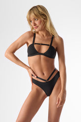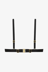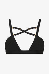The Bandeau bikini top Fatale is crafted from opaque, soft microfiber for a second-skin feel. Its sculpting fabric naturally follows the curves, with bust darts for enhanced structure. Its signature detail: a masterful bondage of elastic straps. The adjustable and removable elastics at the neckline allow for multiple styling options: straight, crossed, or none. The fixed straps are also adjustable with delicate gold-toned metal accents. The back is adjustable and fastens with a gold clasp. The design is unpadded and wireless, offering natural comfort.