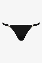 The Fatale bikini bottom is crafted from soft, opaque, and sculpting microfiber for a second-skin feel. Its barrette-style cut is elevated at the back by a keyhole detail fastened with a golden ring, adding a graphic touch. The side elastics, covered in microfiber, are non-adjustable and non-removable, but their position can be slightly altered via small gold rings at the front and back, allowing for more or less coverage as desired. This design reflects the line’s signature refined bondage aesthetic, while ensuring comfort and support. Fully lined at the crotch.
