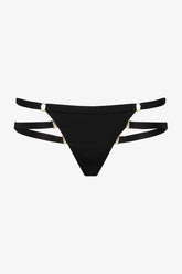 The Fatale String Bikini Bottom is crafted from soft, opaque microfiber for a smooth touch and comfortable fit. The sculpting fabric, lined only at the crotch, delicately hugs the silhouette. Its barrette-style back features graphic lines, while the side elastics, covered in microfiber and joined by golden rings at the front and back, allow for customizable coverage. The thigh elastics are fully adjustable and completely removable thanks to gold metal hooks, offering a refined bondage effect that remains entirely versatile.