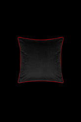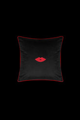 A kiss left in velvet. The scalloped FRENCH KISS cushion spreads its aura across the fabric. It features an embroidered red mouth on deep black velvet, like a stolen kiss. A red velvet piping outlines its edge, for a subtly contrasted finish.
