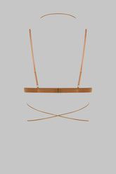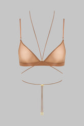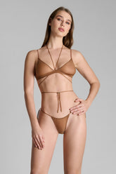 Wireless triangle bra crafted from a fine jersey with shiny, subtly sheer reflections. Designed to perfectly fit the shape of the breasts with seamless molded triangle cups. The halter lacing is fully removable and adjustable thanks to a unique slider and gold lipstick accessories signed by Maison Close, enhancing your neckline and allowing for personalized styling. Thin, flat adjustable straps ensure a perfect fit. An elastic underband hugs and sculpts the bust. Adjustable hook-and-eye closure at the back.