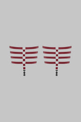 Suspender straps by Maison Close. A jewellery-accented accessory to subtly accentuate your nudity with clusters of fine silver rings and burgundy elasticated ribbons. Adjustable for all body shapes. Pair with all our suspender belts thanks to the rings at the top of the suspender straps. Four adjustable, non-removable suspender straps, with silver accessories, call for stockings to complete the look.