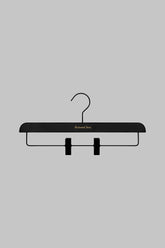 Maison Close wooden hanger with metal hook and clips. Matte black with gold logo. Ideal for hanging up your skirts and trousers, it's the ultimate accessory for showing off your wardrobe.