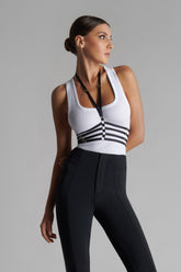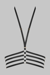 Parure Signature Harness by Maison Close. Clusters of fine gold rings and elastic ribbons create a jewellery-accented accessory to subtly accentuate your nudity. Adjustable to suit all body shapes.