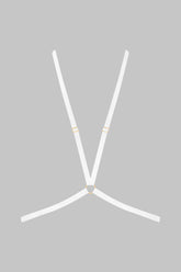 Neon Signature harness stamped with the Maison Close logo. Elasticated bands linked with a ring, with adjustable gold sliders. Wear between cleavage or at the back to suit you. Clip fastening on the back.