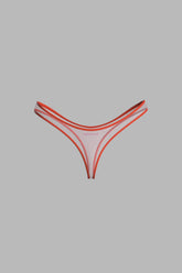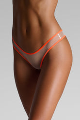 Thong in transparent pastel tulle, outlined with ultra-flat fluorescent elastic. A high-cut 80s-style silhouette that elongates the legs. Maison Close logo in relief at the back. No cotton lining for complete transparency.