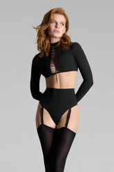 This high-waist thong from the Nuit Infinie collection, featuring adjustable and detachable garter belts, is designed to blend comfort and sensuality. Graphic cut-outs structure the front, while the thong cut ensures a perfect fit at the back. The high waist enhances a sculpted silhouette, combining elegance with allure.