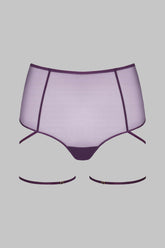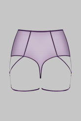 High-waist panty in 100% sheer mesh. Cross seams extended into adjustable, non-removable thigh garters.