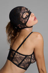 This balaclava features mostly recycled openwork lace. Fitted style and cat eyes with flat elasticated trim. Concealed opening at the back to let hair through. Gold clasp on back.