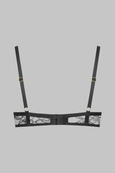 The Balconette Bra JEUX MAGNÉTIQUES draws a direct line between lace and desire. Its underwired shape naturally enhances the bust, while the cross-over neckline, closed by subtle golden magnetic buttons, orchestrates a controlled revelation. Floral lace embraces the curves with finesse. Adjustable elastics at the neckline, adjustable straps, and back fastening ensure a precise fit. Each button becomes a gesture, each opening a thrill. A piece designed for players, those who know when everything must shift.