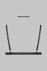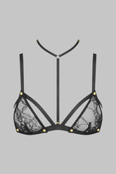 The Triangle Bra Harness JEUX MAGNÉTIQUES embraces bold openness. Wireless, it envelops the bust in delicate floral lace, fully detachable thanks to a series of golden magnetic buttons. An architecture as delicate as it is subversive. Under the bust, a microfiber-covered elastic band brings softness and support. The removable harness, to slip around the neck, completes the piece by accentuating the bust line. A versatile bra, to transform according to desire and the moment.