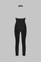 This halter-neck catsuit from the Nuit Infinie collection combines structure and sensuality. Featuring 300 eyelets on each side, it offers full-length lacing adjustable from the armholes to the ankles, creating a perfectly tailored silhouette. The open back and adjustable halter neckline with a black metal hook and three settings enhance its contemporary appeal, while the graphic details of the rigid cords highlight the body’s curves.